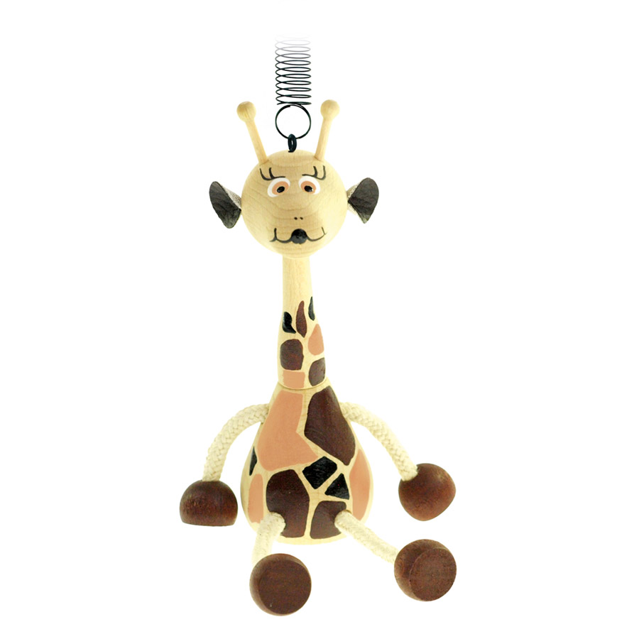 Handgemalte Springfigur Giraffe aus Holz. Lustiger, bunter Hüpfer mit Feder. An der Decke, über dem Kinderbettchen oder Wickeltisch sorgt dieser für Aufmerksamkeit. Mit dem Holzring leicht an einem Haken einzuhängen.